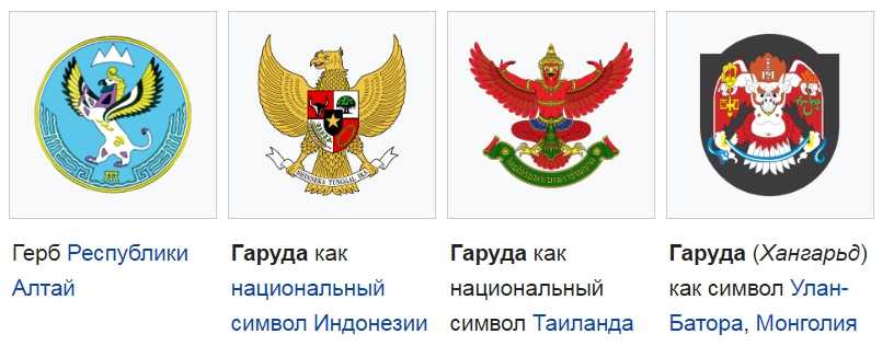 Символ орла Гаруды используется в восточной государственной геральдике. Он является национальным символом Индонезии и Таиланда, присутствует на гербе столицы Монголии — Улан-Батора. А также это государственный символ Республики Алтай.