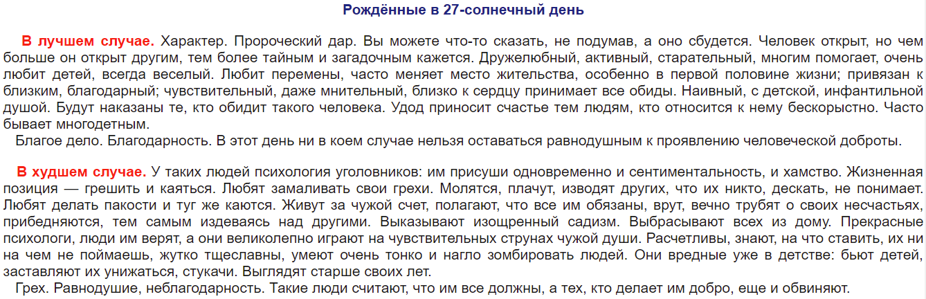 Люди, рожденные в 22 солнечный день, несмотря на все свои положительные личные качества имеют и изъяны. Так, их кристальная честность, стремление к моральной чистоте многими воспринимается как занудство и пагубно отражается на их личной жизни и карьере.