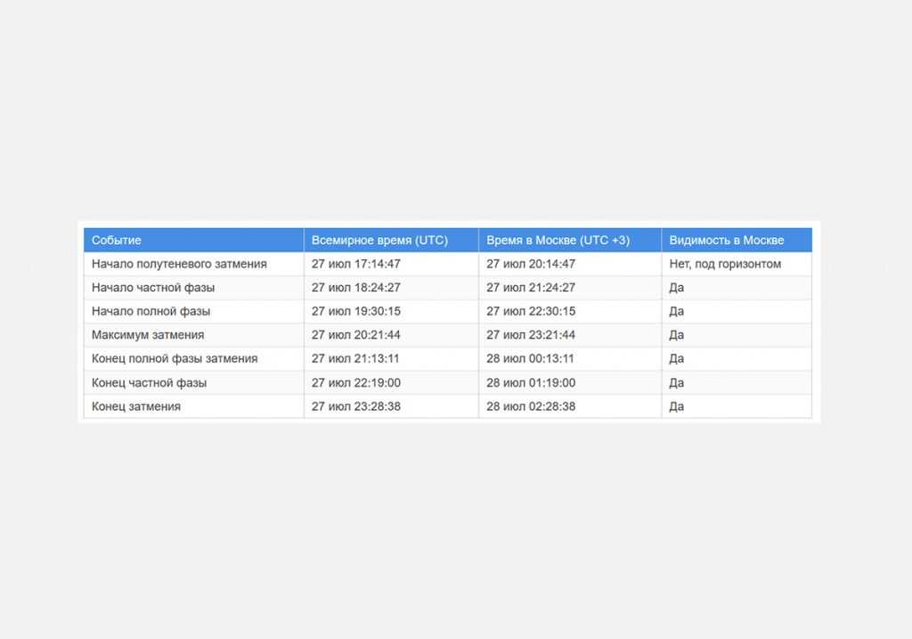 Таблица: время и моменты полного лунного затмения 27–28 июля 2018 года для Москвы. Источник