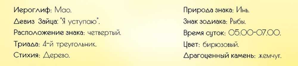 Кролик – 4-й знак в китайском календаре животных. Имеет свое субъективное видение на многие вещи и смело говорит об этом. Он коммуникабелен, легко поддерживает любую интересную тему для разговора, но не отличается открытостью. Они не доверяют малознакомым людям, имеют хорошо развитую интуицию. В любом обществе способны показать себя с выгодного ракурса, но могут показаться заносчивыми. Кролики излишне концентрируются на деталях. Являются глубокими эстетами, ценят все прекрасное, что есть в этом мире.