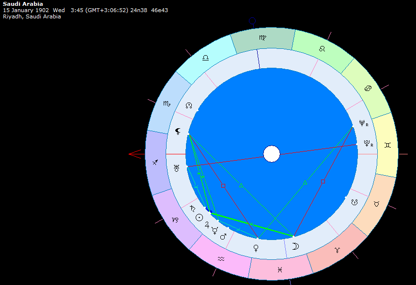 Главный центр суннитского ислама. Гороскоп построен на 15 января 1902, день захвата Эр-Рияда Абдул-Азизом, который положил начало современной монархии саудитов.