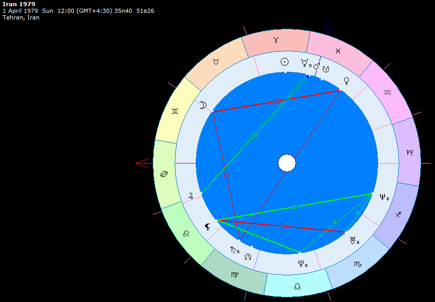 Главный центр шиитского ислама. Гороскоп построен на 1 апреля 1979, когда аятолла Хомейни провозгласил Исламскую Республику. Есть мнения, что это было в 15 часов дня, тогда как другие источники сообщают, что дело было ночью. В любом случае, поскольку здесь мы не анализируем дома гороскопа, для нас точное время не очень принципиально.