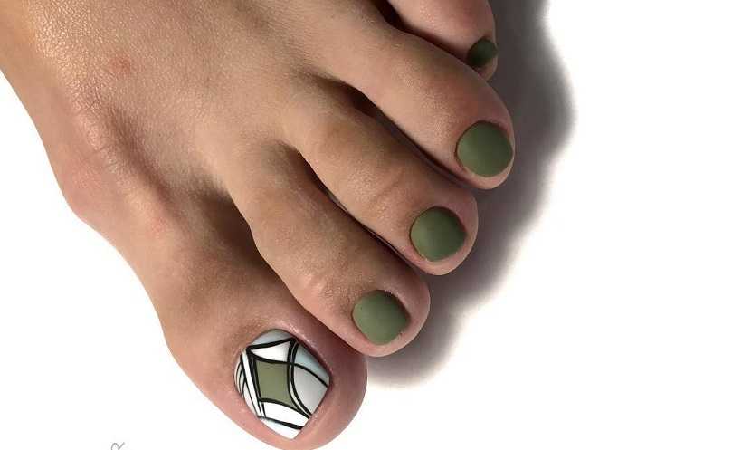 Однотонный педикюр с рисунком на одном ногте