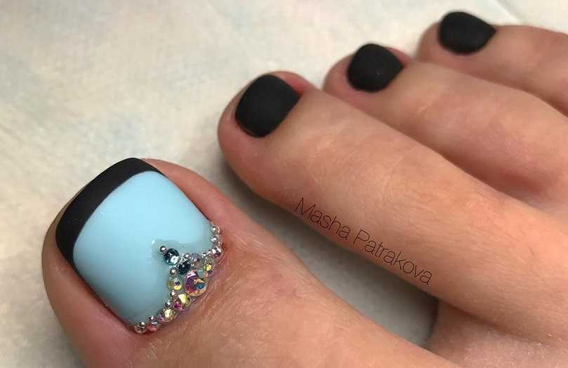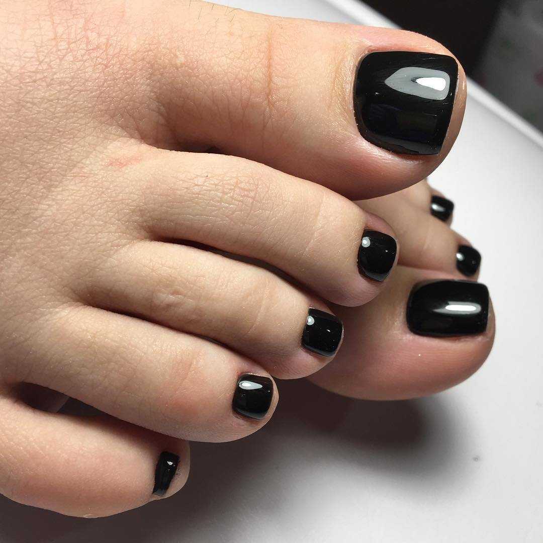 Как уже говорилось выше, не теряет свой популярности черно-белый педикюр. Также очень стильно смотря ноготки, покрытые черным лаком, однако, в этом случае стоит учитывать тот факт, что это самый «капризный» цвет, который требует особого обращения. Лучше всего сделать гелевый педикюр, чтобы не создать эффект грязных ногтей. А для вечернего образа, стоит украсить такой педикюр сверкающими стразами или утонченными бусинками.