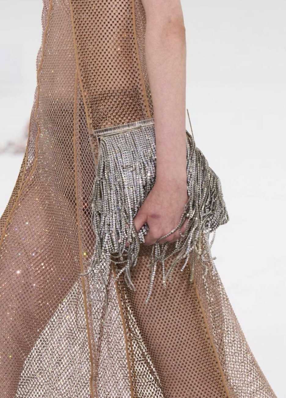 Особенно, знаменательно использование эффекта бахромы и расположения кристаллов в виде сети, тем самым закрепляющих тренды нового сезона и новые highlights.