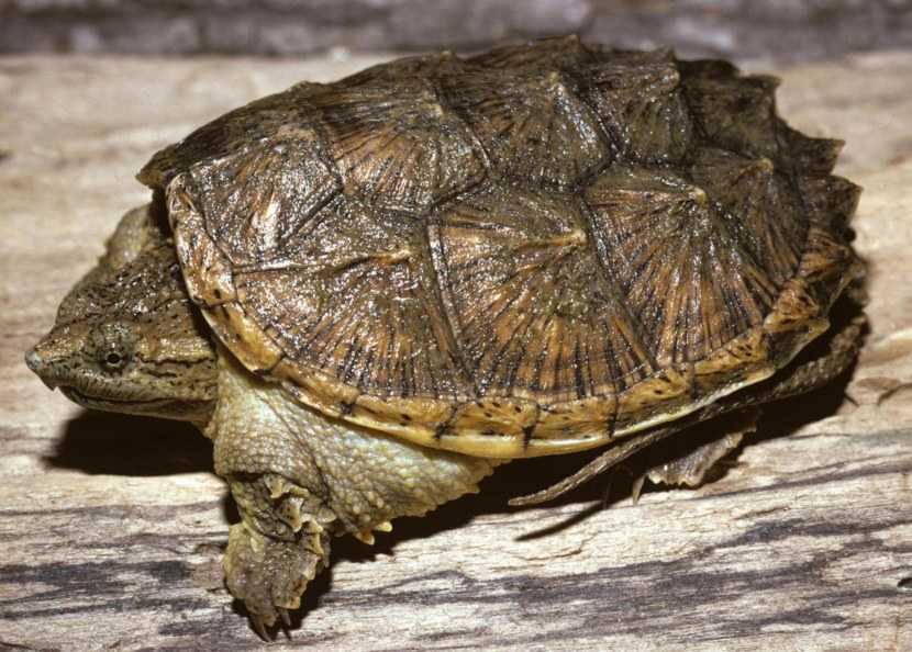 4. Грифовая черепаха (лат. Macroclemys temminckii). В длину может достигать 1,5 метров, панцирь – 1,4 м. Обитает в реках, каналах юга США. Это одна из самых легких по весу черепах: их масса не превышает 60 кг. При этом среди сухопутных черепах самая крупная.
