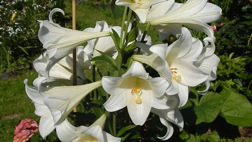 - Лилия Белая, Белоснежная или чисто-белая — этот сорт можно встретить на участках каждого любителя лилий. Растение не самые высокое, может вырасти до 1,3 метра. Цветы среднего размера — до 15 см в диаметре. Цветки имеют широковоронковидную форму, окрашены в чистый белый цвет, и на фоне листье ярким желтым пятном виднеется пыльца. Цветет в июне и июле, и помимо декоративных целей это растение используют в косметологии и медицине.