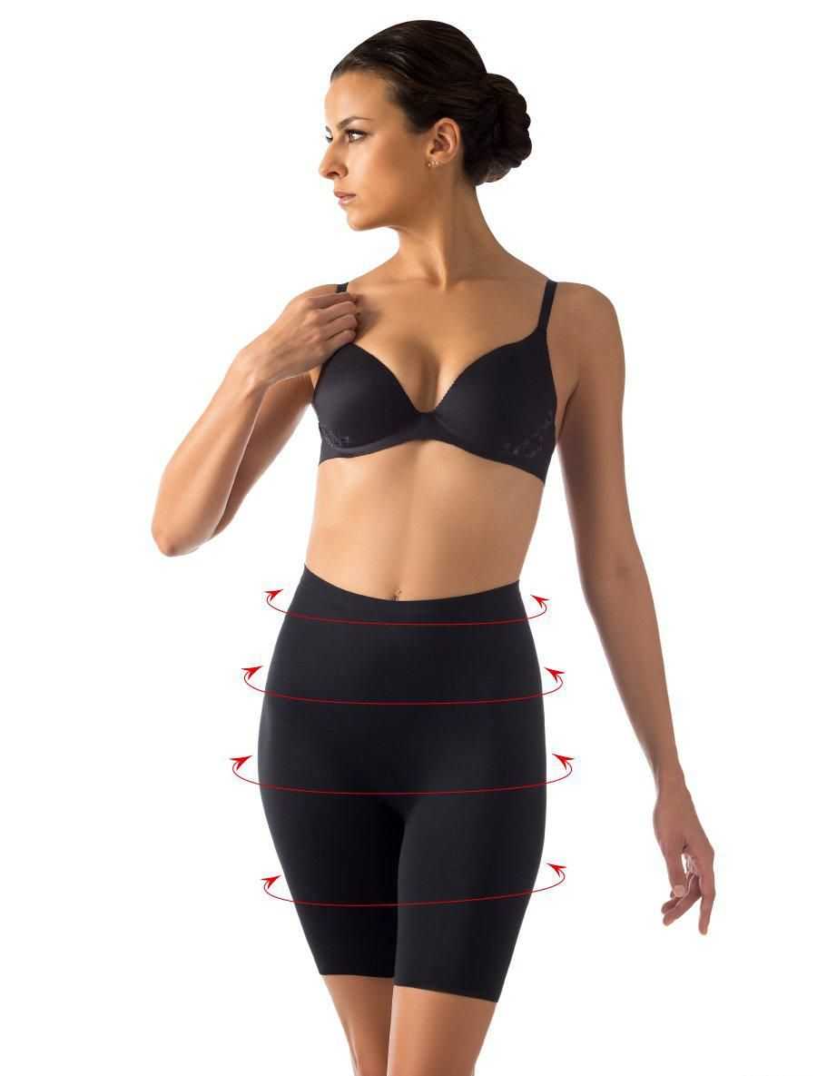 Панталоны скрывают полный живот, бедра. Средняя коррекция позволит только выровнять контуры. Изделия с укрепляющим эффектом визуально уберут 1 размер.
