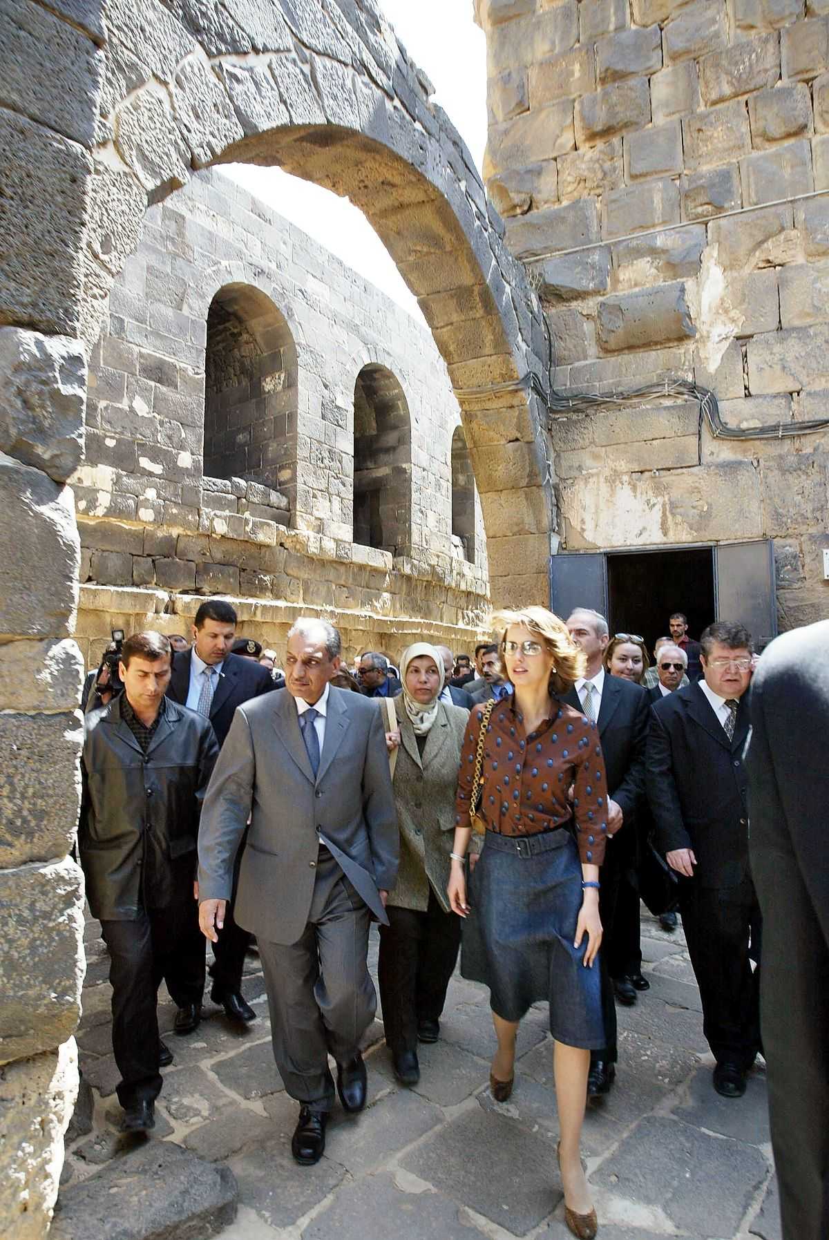 Асма Асад идет по замку у древних руин Босры — древнего римского города на юге Сирии, 31 марта 2004 г.