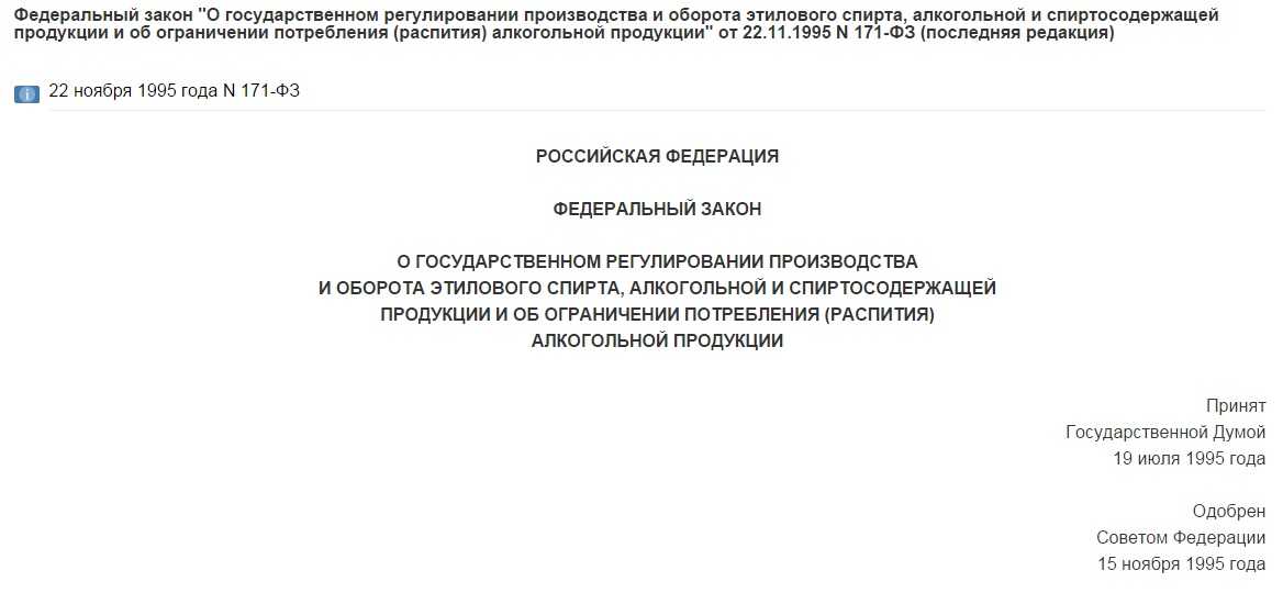Главным федеральным законом, устанавливающим требования к производству и розничной продаже алкоголя является 171-ФЗ от 22.11.1995 года «О государственном регулировании производства и оборота этилового спирта, алкогольной и спиртосодержащей продукции…». В статье 16 данного Закона перечислены особые требования к розничной продаже алкоголя населению. В пункте 9 данной статьи указано, что на федеральном уровне запрещена продажа алкоголя с 23 часов вечера до 8 часов утра следующего дня по местному времени. Данное ограничение сразу назвали своеобразным аналогом «сухого закона» в российском исполнении.