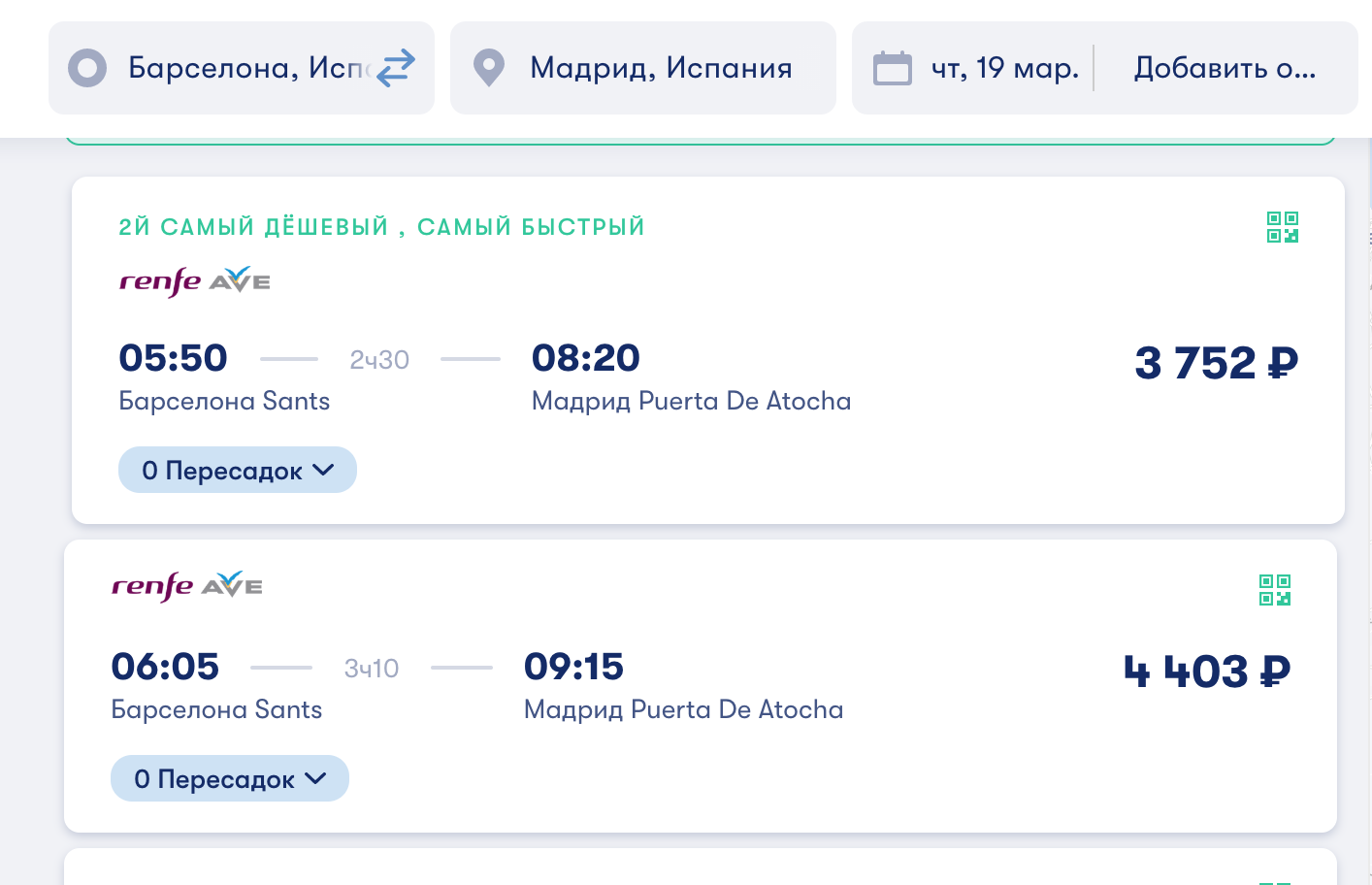 - В Барселоне, на станции Barcelona-Sants, нужно сесть на поезд Ave до Мадрида, он приходит на станцию Madrid-Puetra De Atogha.