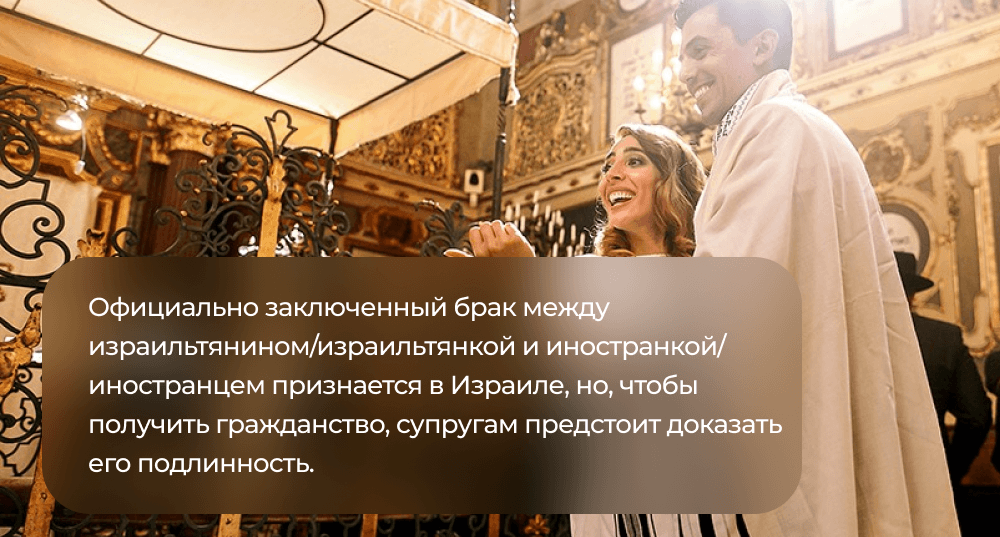 Под гражданским браком в Израиле понимается брак, заключенный адвокатом. Но через такой брак получить гражданство еще сложнее, чем через брак, заключенный за рубежом.