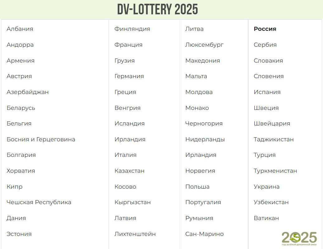 Во внимание берется именно место рождения человека, а не страна его проживания или гражданство. В 2023-2025 году американская DV-lottery доступна лицам, родившимся в таких странах мира: