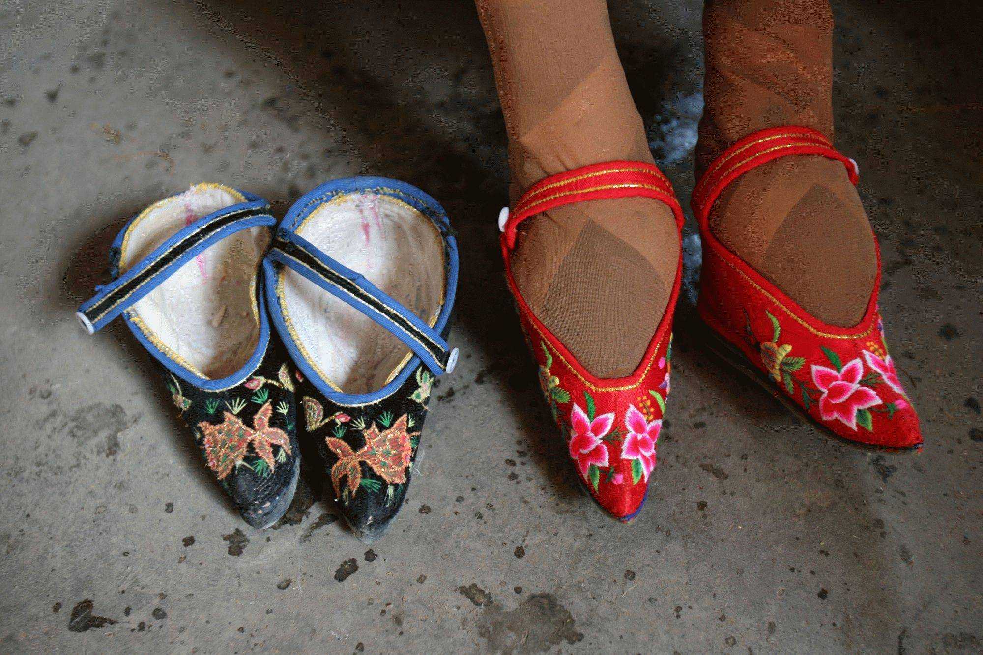 «Золотые лотосы» – так называли изуродованные ступни, которые считались признаком аристократии. С 5-летнего возраста девочкам ломали пальцы ног, загибая внутрь ступни, и забинтовывали, чтобы кости срастались в таком положении. Стопа приобретала форму треугольника и значительно уменьшалась в размерах. Девушки, размер ноги которых не превышал 7 см, выходили замуж за богатого мужа и могли всю жизнь не работать.