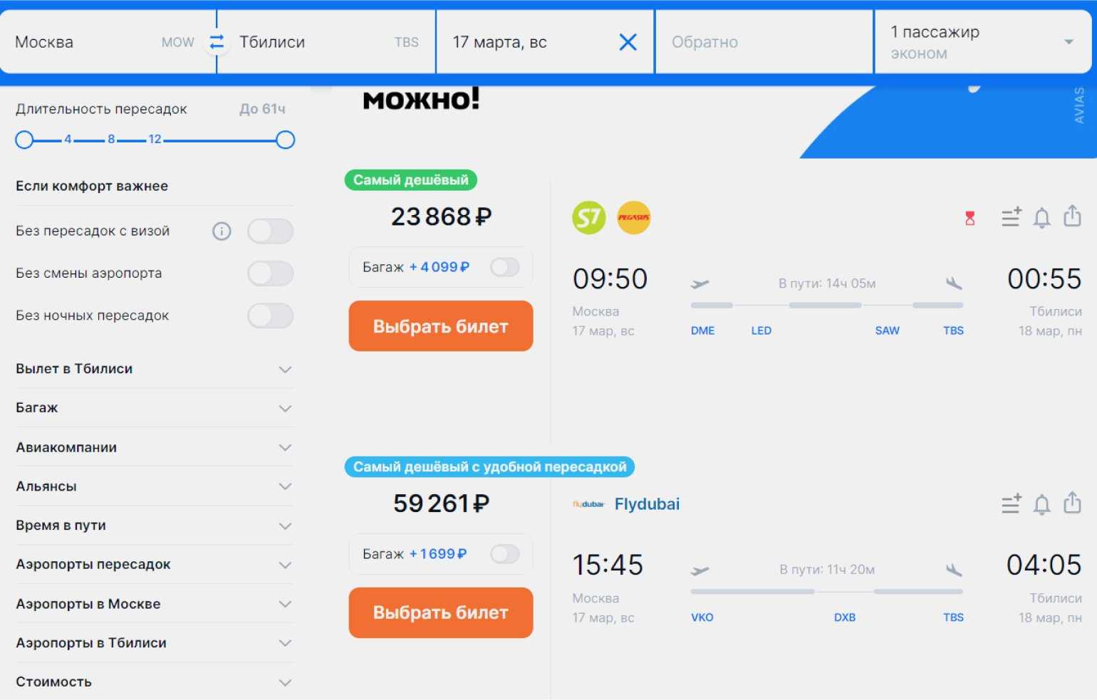 Один из лучших способов уехать из Москвы — долететь до Владикавказа и там заказать трансфер в Тбилиси. Стоимость такой поездки в марте составляла 11 368 рублей. Дороже обойдётся перелёт в Тбилиси с пересадкой в Ереване — от 24 000 рублей.
