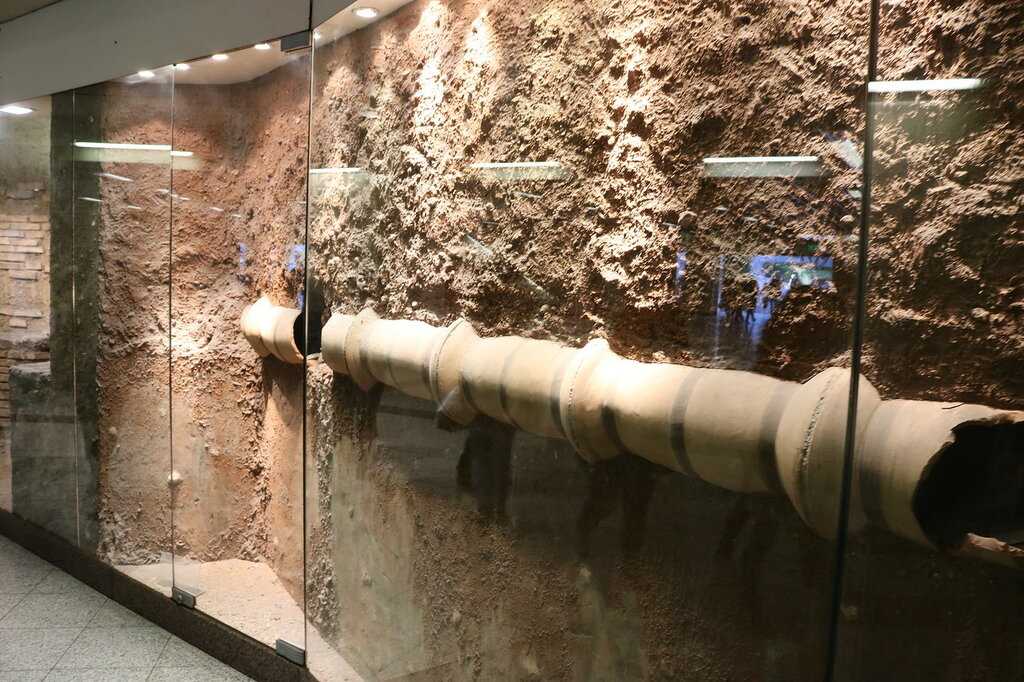 Найденные древности не отправили в музеи, а выставили тут же, на станциях, поместив в стеклянные витрины, встроенные прямо в стены.