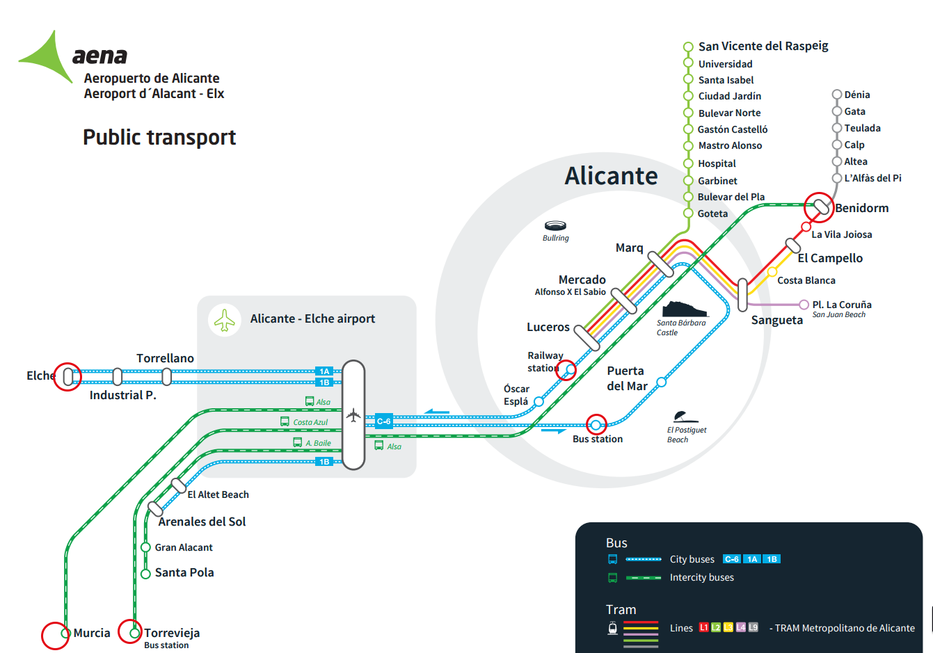 Из аэропорта Аликанте достаточно легко уехать в Бенидорм на рейсовом автобусе, который курсирует в течение всего дня, за исключением ночных часов. Рейсы выполняет автобусный перевозчик Alsa. Первый рейс отправляется в 6.15 и далее каждый час, начиная с 8.00 и до 23.00. Стоимость проезда составляет 9,65 евро в одну сторону. Конечной станцией в Бенидорме является Бульвар Европы или автовокзал.