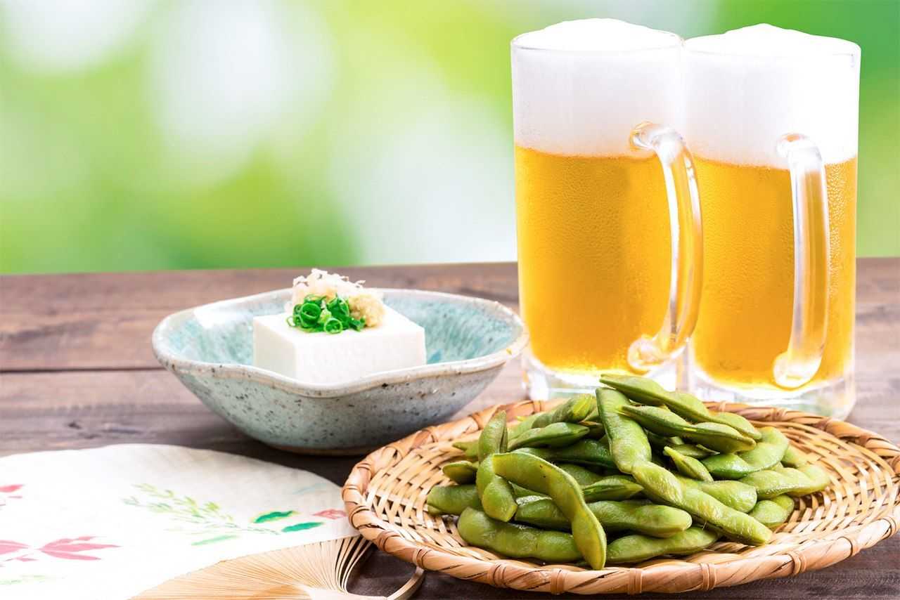 Пиво, бобы эдамамэ и блюдо хияякко (охлаждённый тофу)
