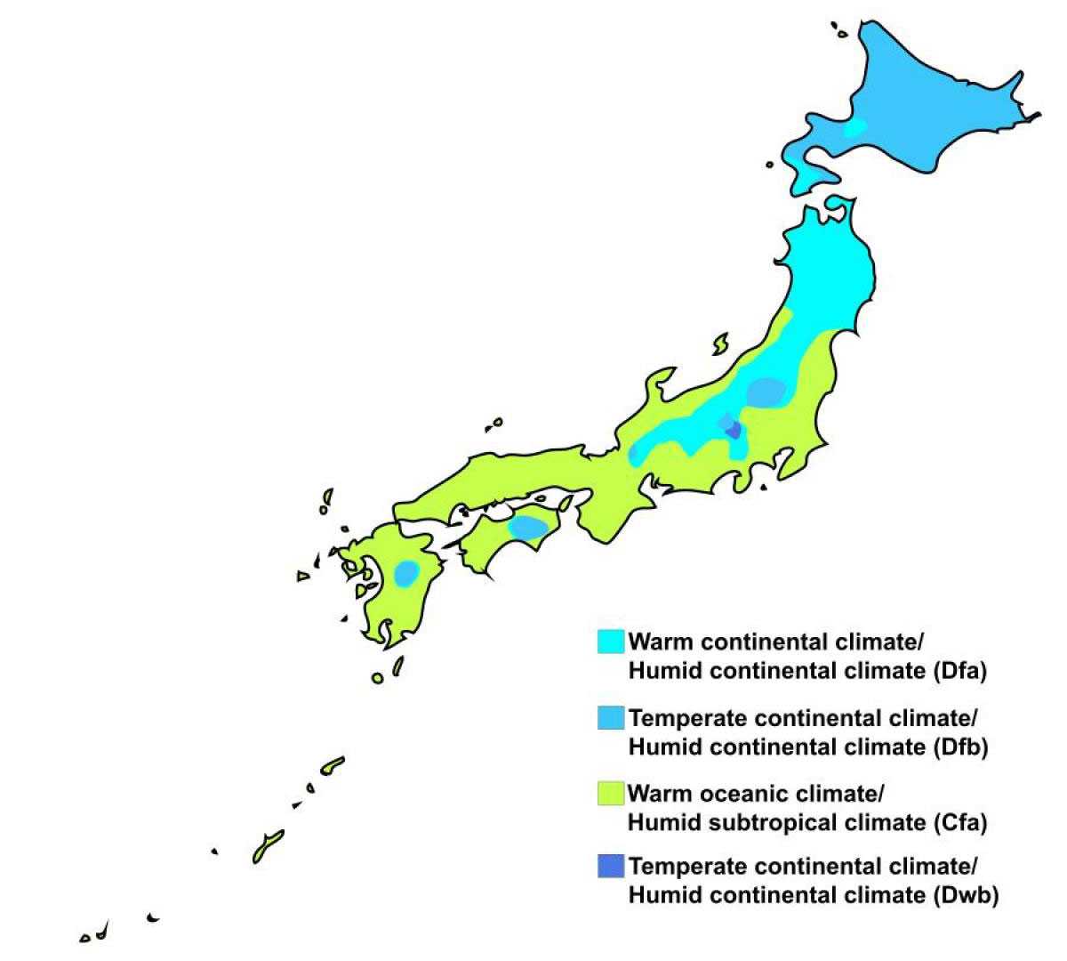 Умеренный климат на японских землях ознаменован холодными зимами, туманными веснами и коротким летом. Там, где господствует субтропическая зона, знойное лето смягчается сильными морскими бризами, а зимние дни становятся теплее и мягче.