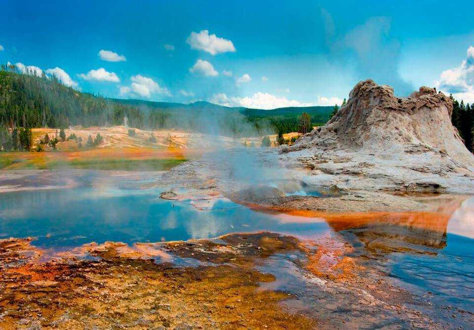 Первым настоящим национальным парком не только в США, но и в мире стал Йеллоустон в 1872 году. С этого момента примеру американцев последовали и правительства других стран. Он стал отправной точкой для создания в 27 штатах США 58 национальных парков и многих других природоохранных территорий. Национальный парк находится на территории сразу трех штатов Айдахо, Монтана и Вайоминг, охватывая площадь около 9 тысяч кв. км. Основной достопримечательностью парка являются гейзеры и горячие источники. Под воздействием различных минеральных солей, растворенных в воде, за многие миллионы лет образовались причудливые формы поверхности: пирамиды, террасы и даже сталактиты.