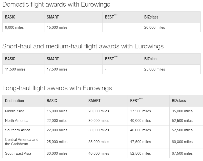 Для полетов короткой и средней продолжительности у Eurowings действует собственная таблица, так как Eurowings использует свою систему тарификации.