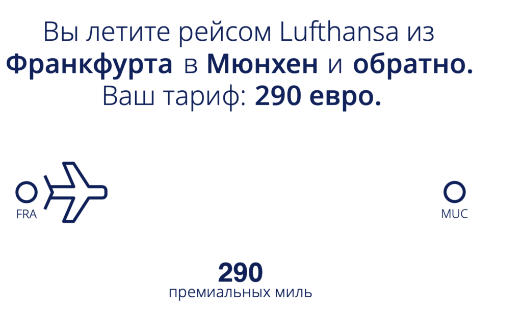 Например, вы летите из Франкфурта в Мюнхен за 290 евро и не являетесь статусным участником программы лояльности. Тогда за перелет вы получите 1160 миль.