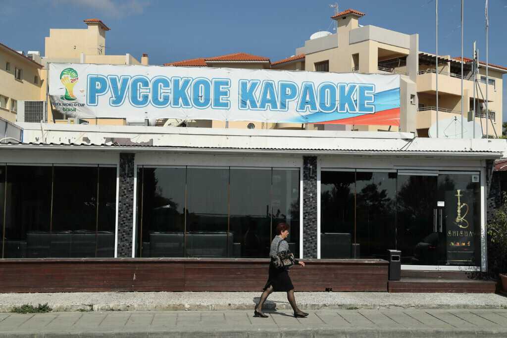 Женщина проходит мимо русского караоке-бара в Лимассоле | Шон Гэллап / Getty Images