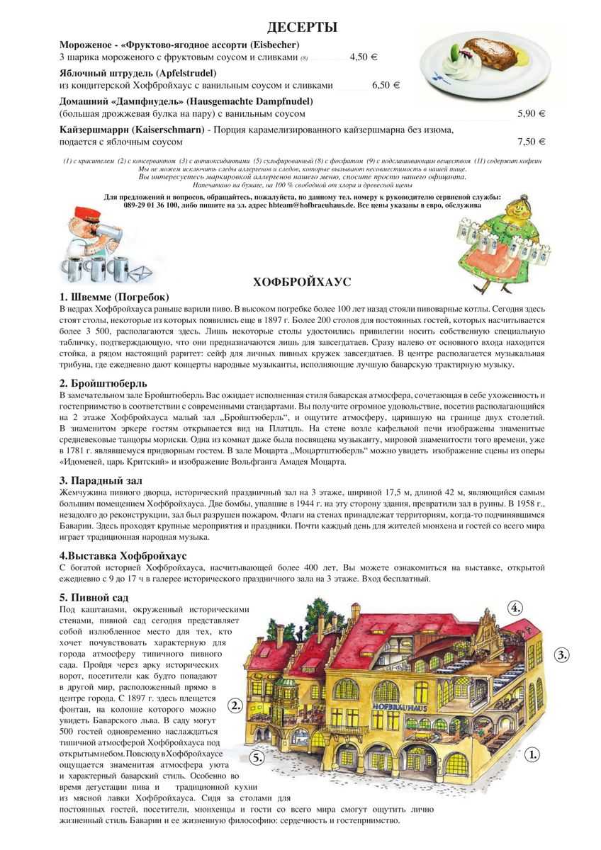 В меню ресторана есть, как обычные классические, так и изысканные немецкие блюда, способные покорить сердце любого гурмана. Здесь работает высококвалифицированный персонал, который поможет вам разместиться и осуществить заказ. Удобно то, что расплатиться в заведении вы можете кредитной картой. Цены здесь достаточно высокие, что связано со статусом и расположением «Weisses Brauhaus».