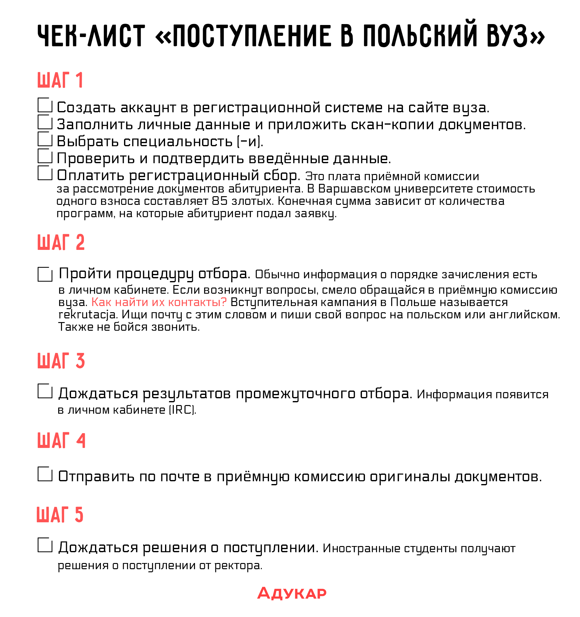 Кроме того, держатели Карты поляка могут поступить в польский вуз через консульство. Для этого абитуриент должен дождаться объявления о начале отбора на сайте консульства – как правило, вступительная кампания стартует с 20 апреля. От претендента потребуется заполнить анкету и предоставить в консульство документы об образовании и Карту поляка. Все экзаменационные мероприятия проводятся в консульстве Польши.